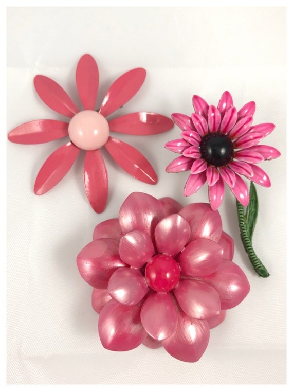 Lot Of 3 Pink Enamel Mod Flower Brooches Pink Flower Pins B Etsy