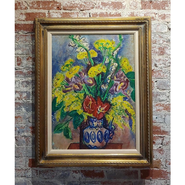 Large Oil Painting Blue Urn Yellow Flowers Signed Dumont 1925