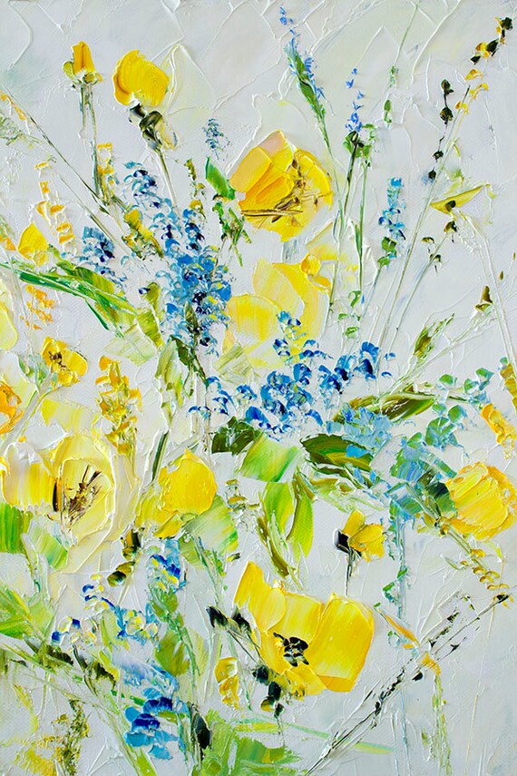 Yellow Blue Flowers Painting Print Floral Canvas Art Yellow Etsy