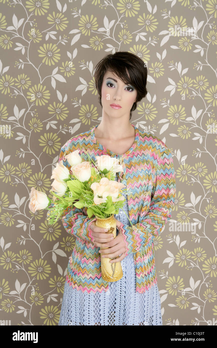 Retro Woman Portrait 60s Fashion Vintage Flowers Wallpaper Stock