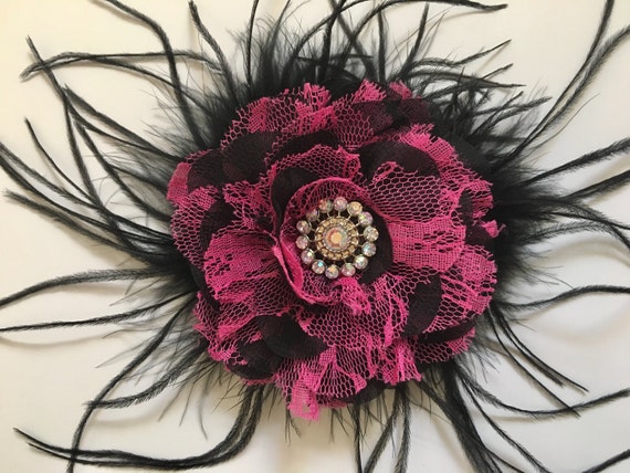 Black And Pink Flower Hair Clip Red And Black Flower Feather Etsy