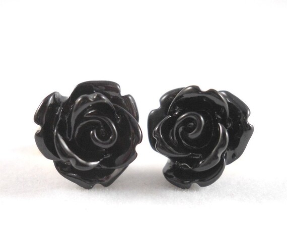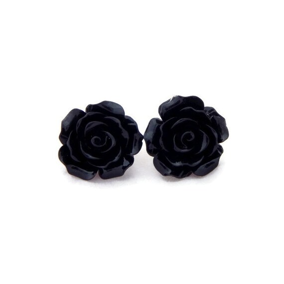 Black Rose Earrings Surgical Steel Posts For Sensitive Ears Etsy