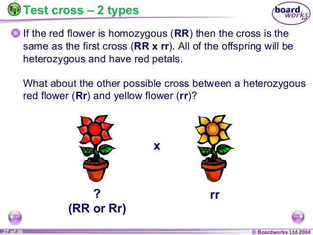 The backcross between a heterozygous monohybrid red flower plant rr and a homozygous recessive white flower plant rr would produce a ratio of 1rr1rr. This means that the f1 generation offspring will be.