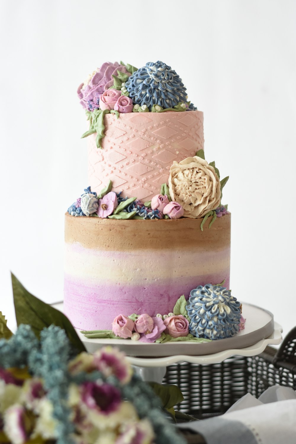 I have 2 versions of buttercream recipe that i use for my cakes. A two tiered pink and gold wedding cake is topped with ranunculi and greenery. You can customize to any kind of cake.