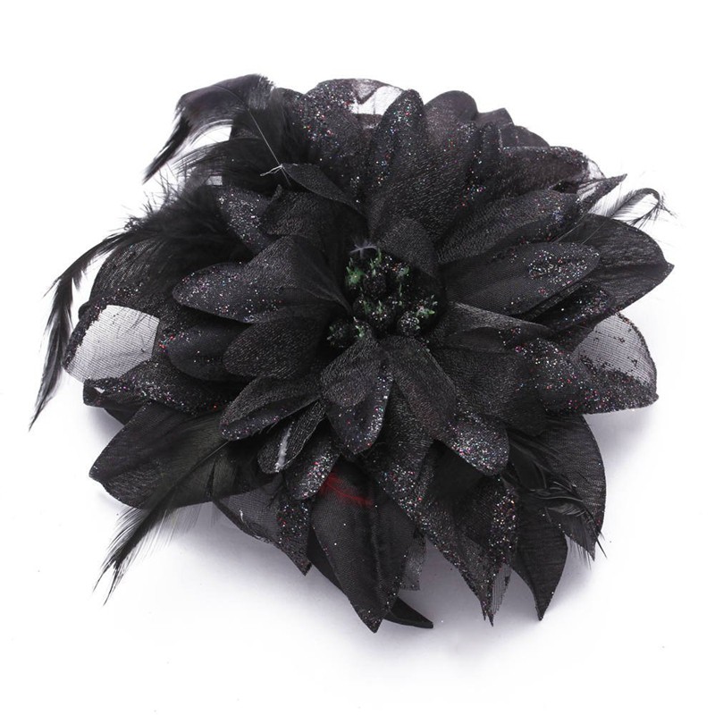 Flower Brooch Pin Headband Ribbon Black Floral Cloth Feather