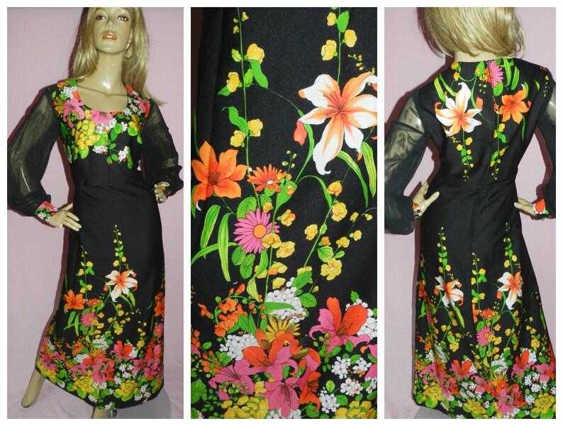 Vintage 70s Psychedelic Black Multicoloured Flower Power Etsy