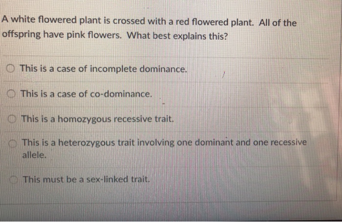 If a pink flowered plant is crossed with a pink flowered plant the progeny plants will be. This means that the allele for red flowers is to the allele for white flowers. If a red flowered plant is crossed with a white flowered plant and the offspring all have pink flowers then most likely this is due to incomplete dominance true in a population of diploid organisms there can only be two alleles for each gene.