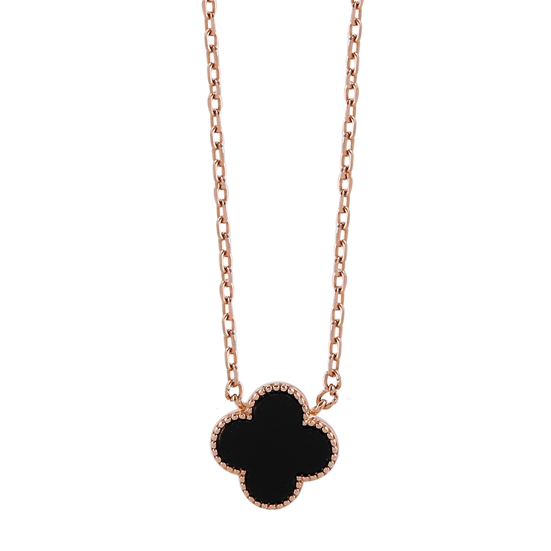 925 Silver Lucky Long Four Leaf Clover Black Onyx Flower Necklace