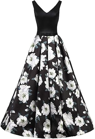 H S Bridal Vintage Long Prom Dresses Black Flower Printed Evening