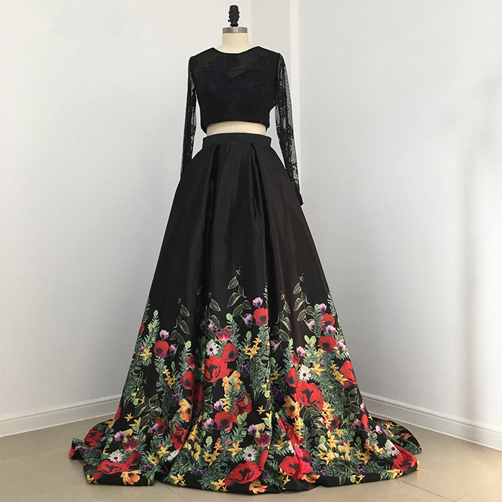 Floral Flowers Pattern Black Two Piece Prom Dresses Long Sleeve