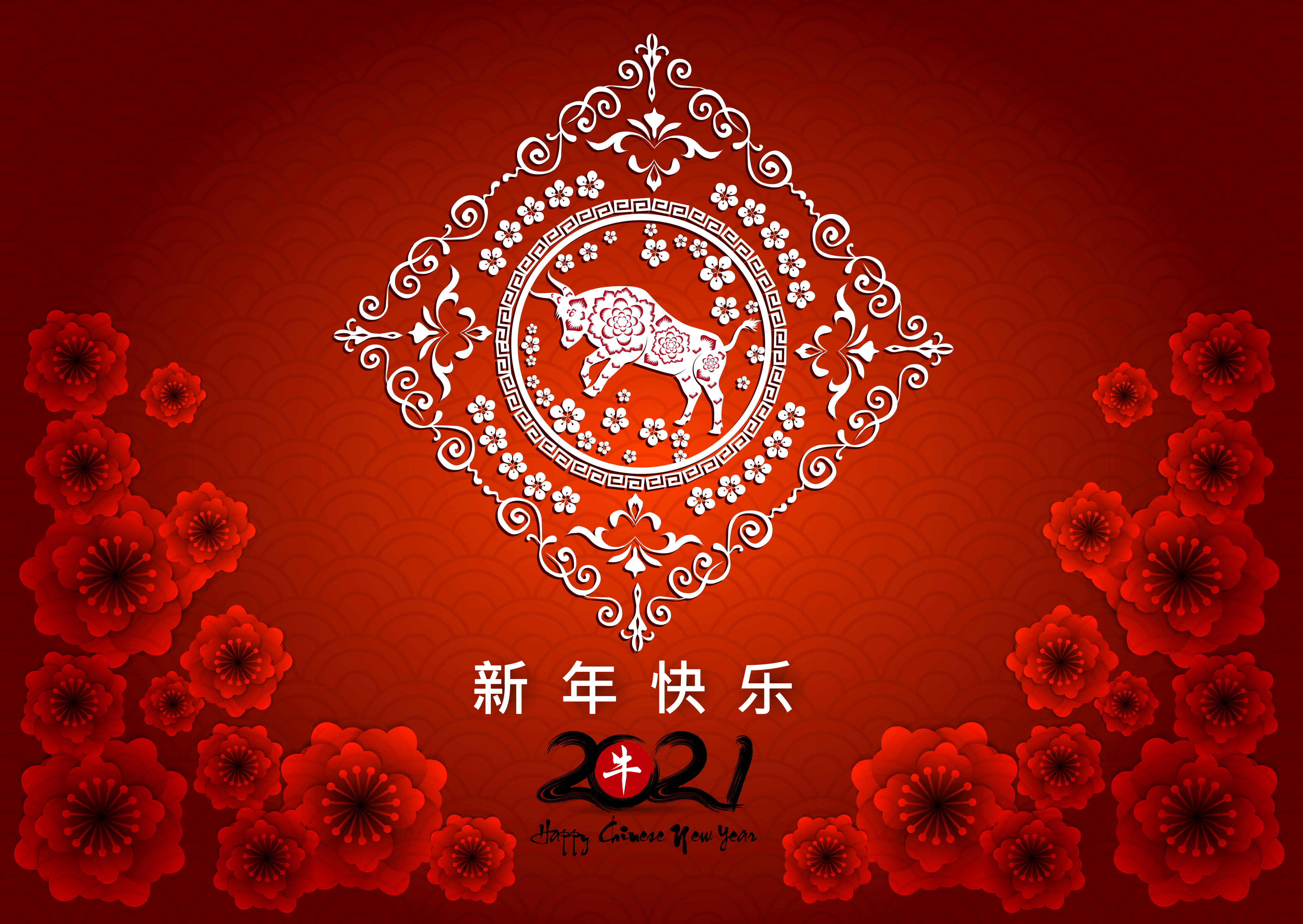 Chinese New Year 2021 With Red Flowers And Ox In Frame Download