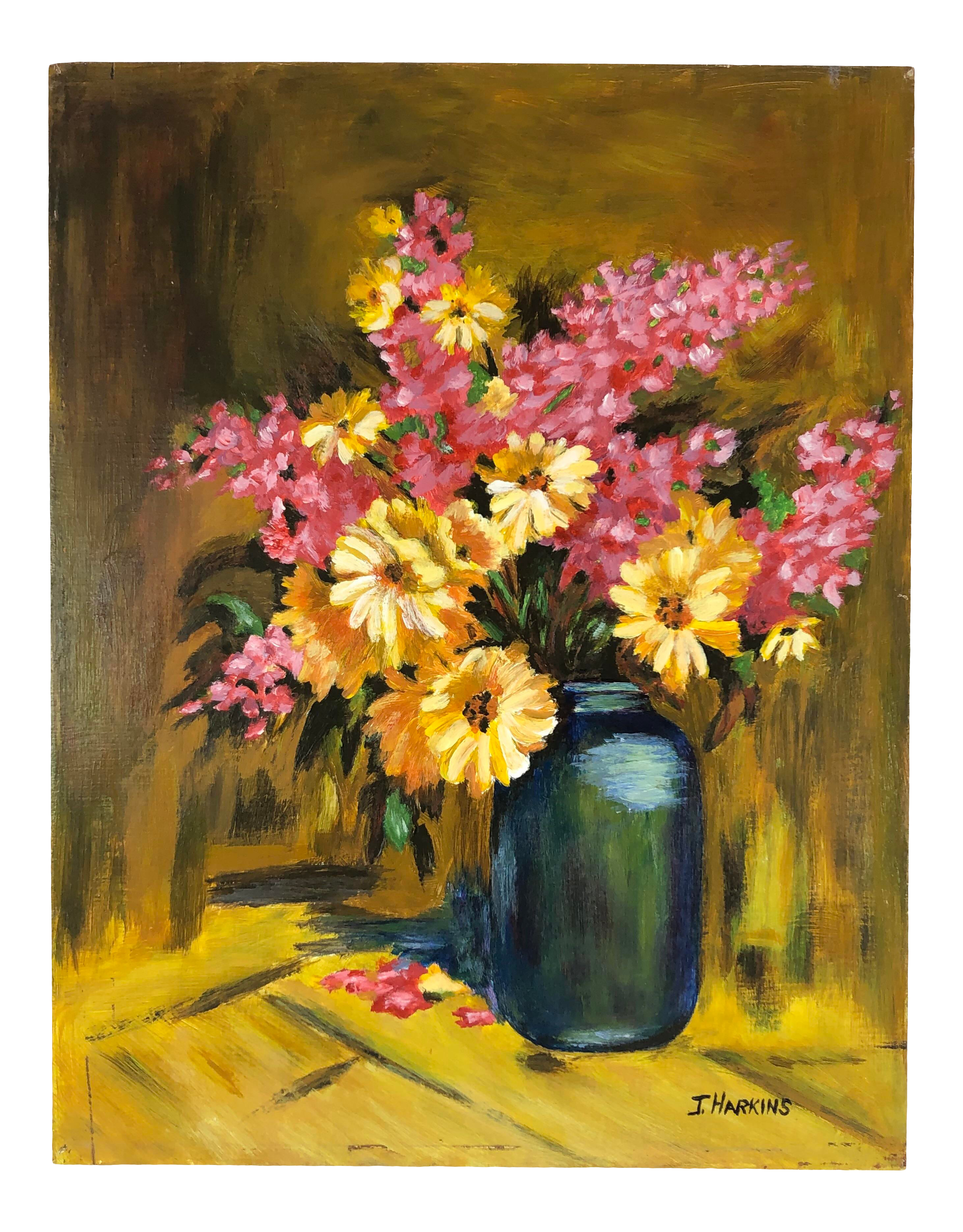 Vintage 1970s Pink And Yellow Floral Still Life Oil On Board