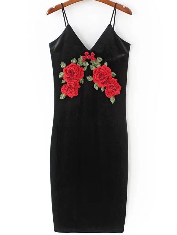 Black Flower Embroidered Velvet Cami Dress Romwe